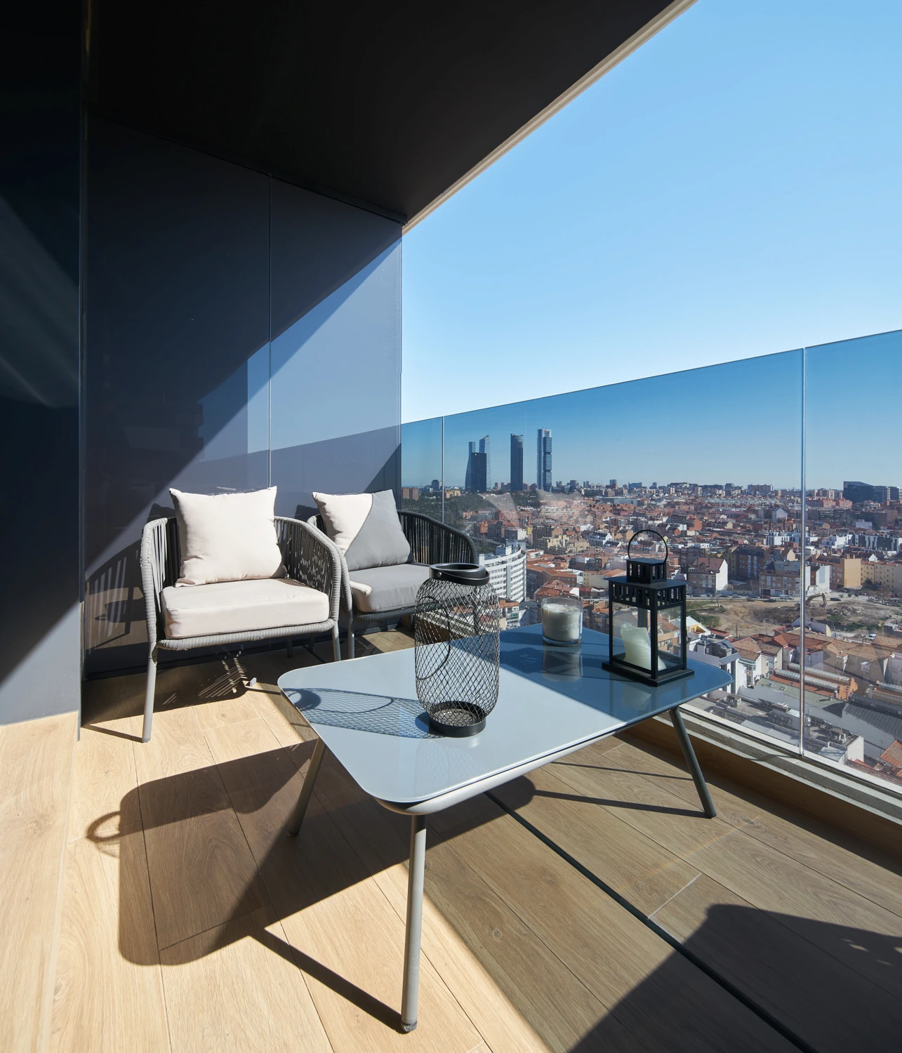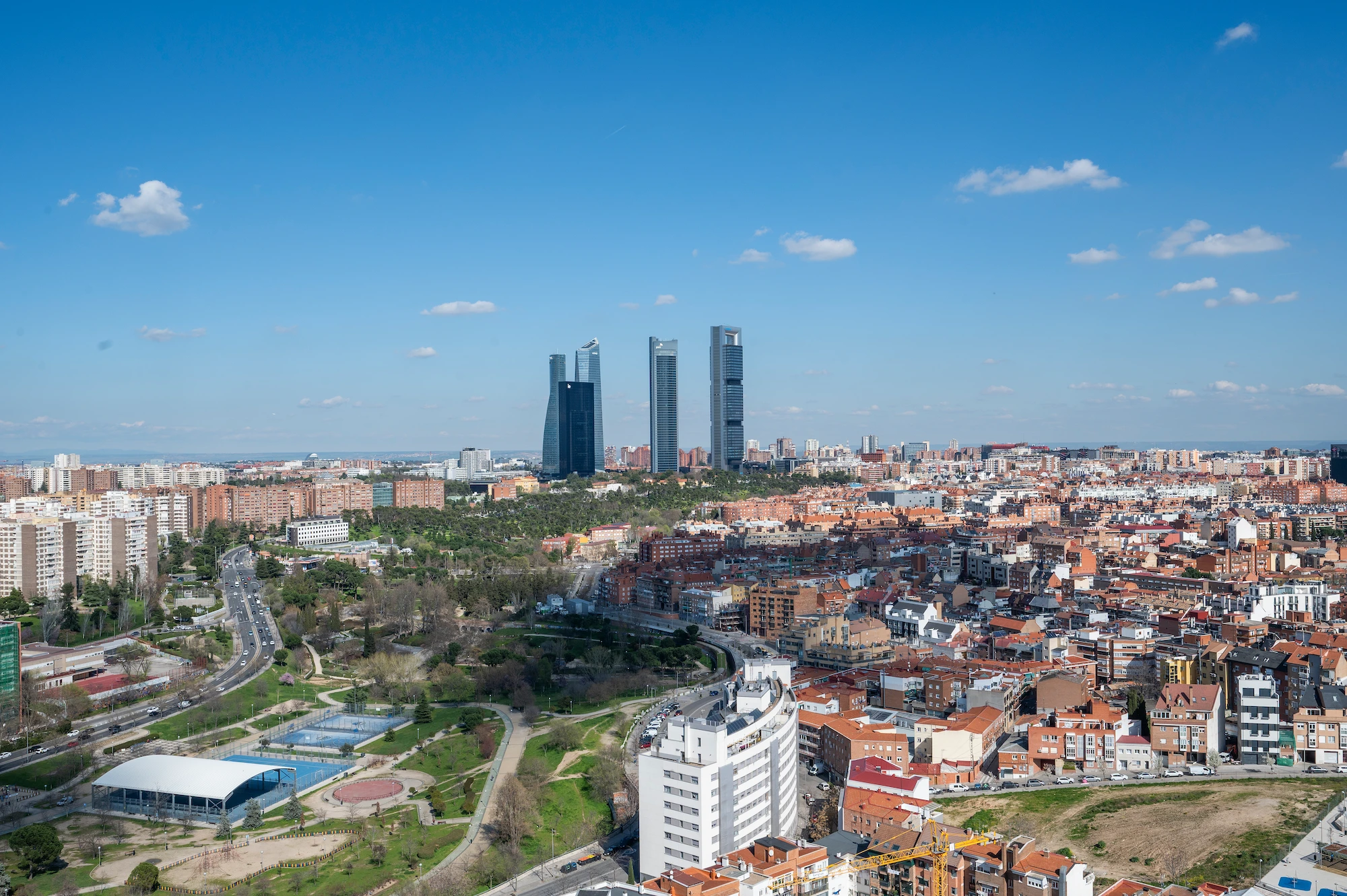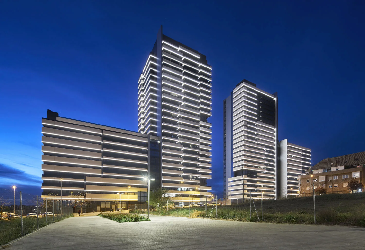 Su diseño contemporáneo destaca por las fachadas acristaladas y las terrazas de hormigón blanco que aportan dinamismo, luz y amplitud. Desde las viviendas se disfrutan vistas verdaderamente excepcionales: panorámicas hacia el skyline financiero de las Cuatro Torres, Madrid Nuevo Norte, Puerta de Hierro y la sierra madrileña. Cada hogar se concibe como un auténtico balcón abierto al horizonte.